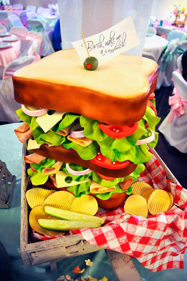 Complicada tarta con forma de sandwitch gigante con todos sus elementos, incluidas las patatas fritas
